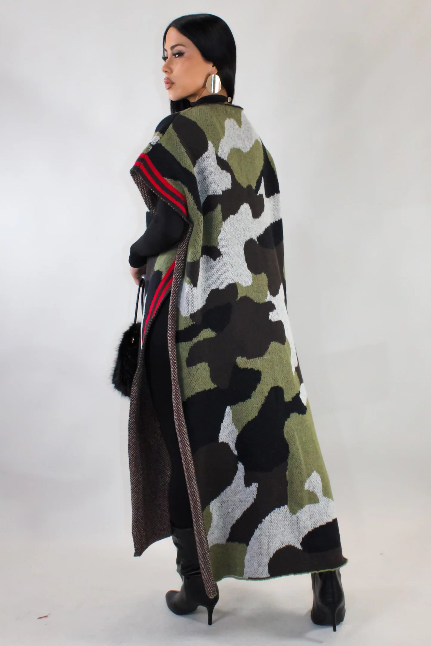 Make an effortless statement in the Command Presence Camo Knit Sweater Cardigan, where bold style meets relaxed sophistication. Designed in a striking camouflage knit, this elevated pullover cardigan delivers cozy comfort with undeniable edge. The one-size, relaxed silhouette features side openings that create fluid movement and a dramatic drape, flattering a variety of body types with ease.