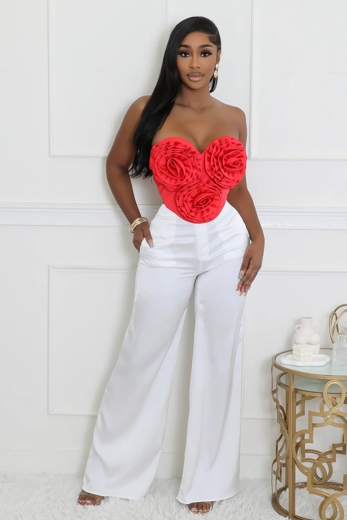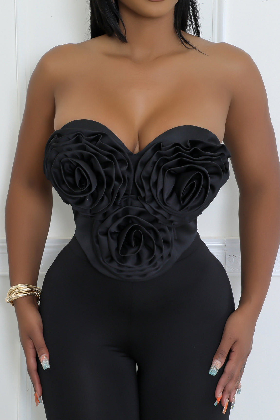 Make a bold, feminine statement in the Rose Desire Sweetheart Corset Top. Designed to turn heads, this striking tube-style top features a sculpted sweetheart neckline adorned with dimensional rose detailing for an elevated, romantic finish.