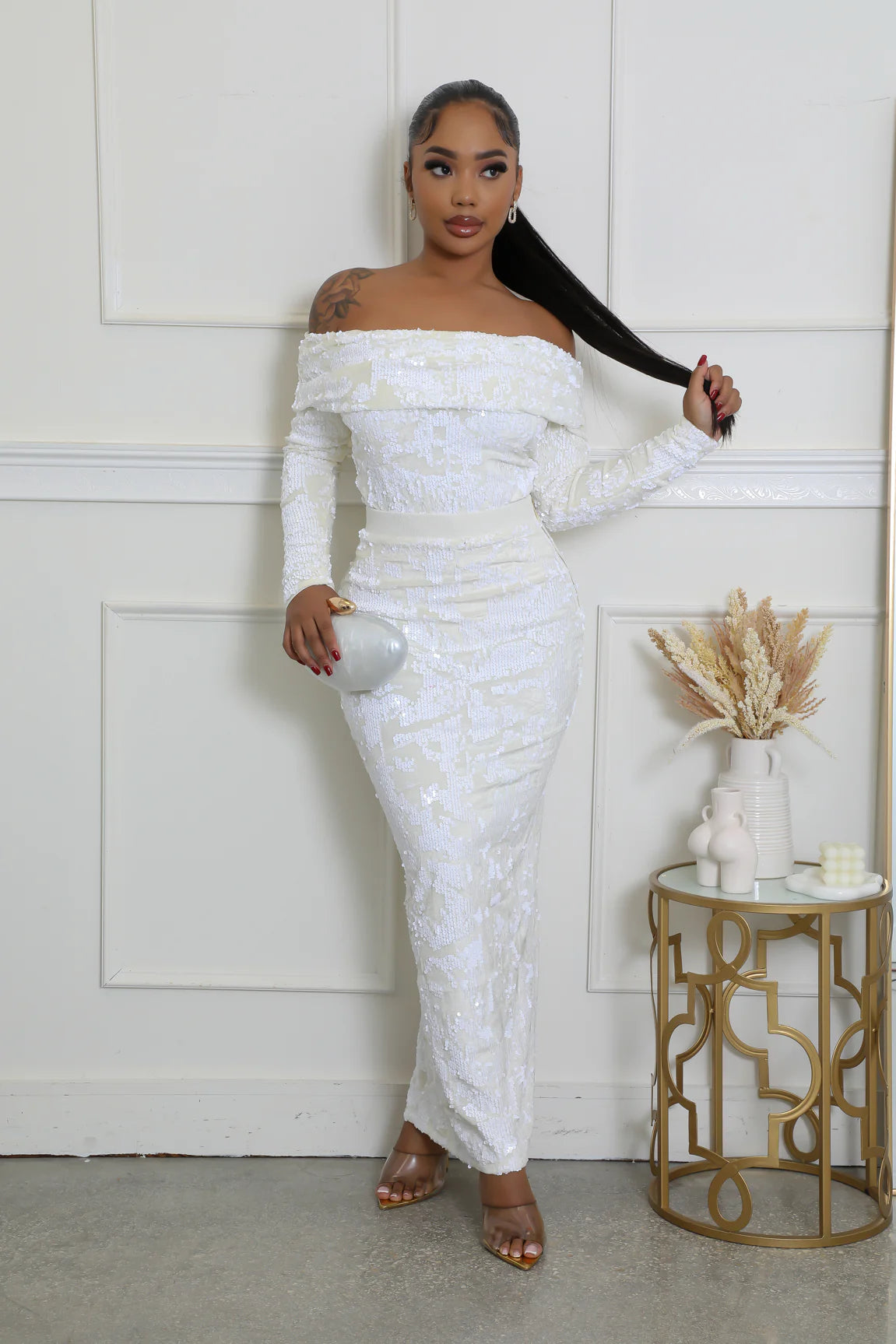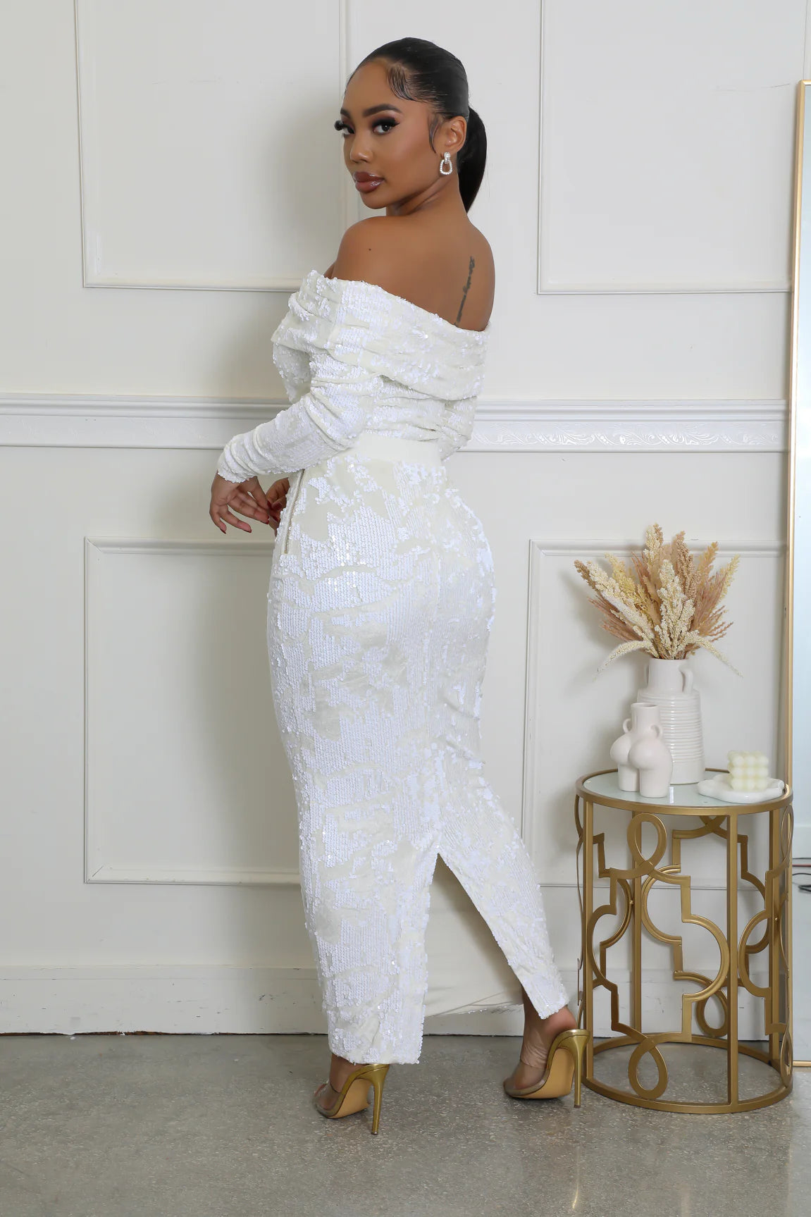 The Midnight Muse Sequin Bodysuit & Skirt Set was made for spotlight energy. Designed with shimmering sequins from top to bottom, this two-piece look features a sultry off-the-shoulder straight neckline, long sleeves, and a curve-defining bodysuit that creates a sleek foundation.