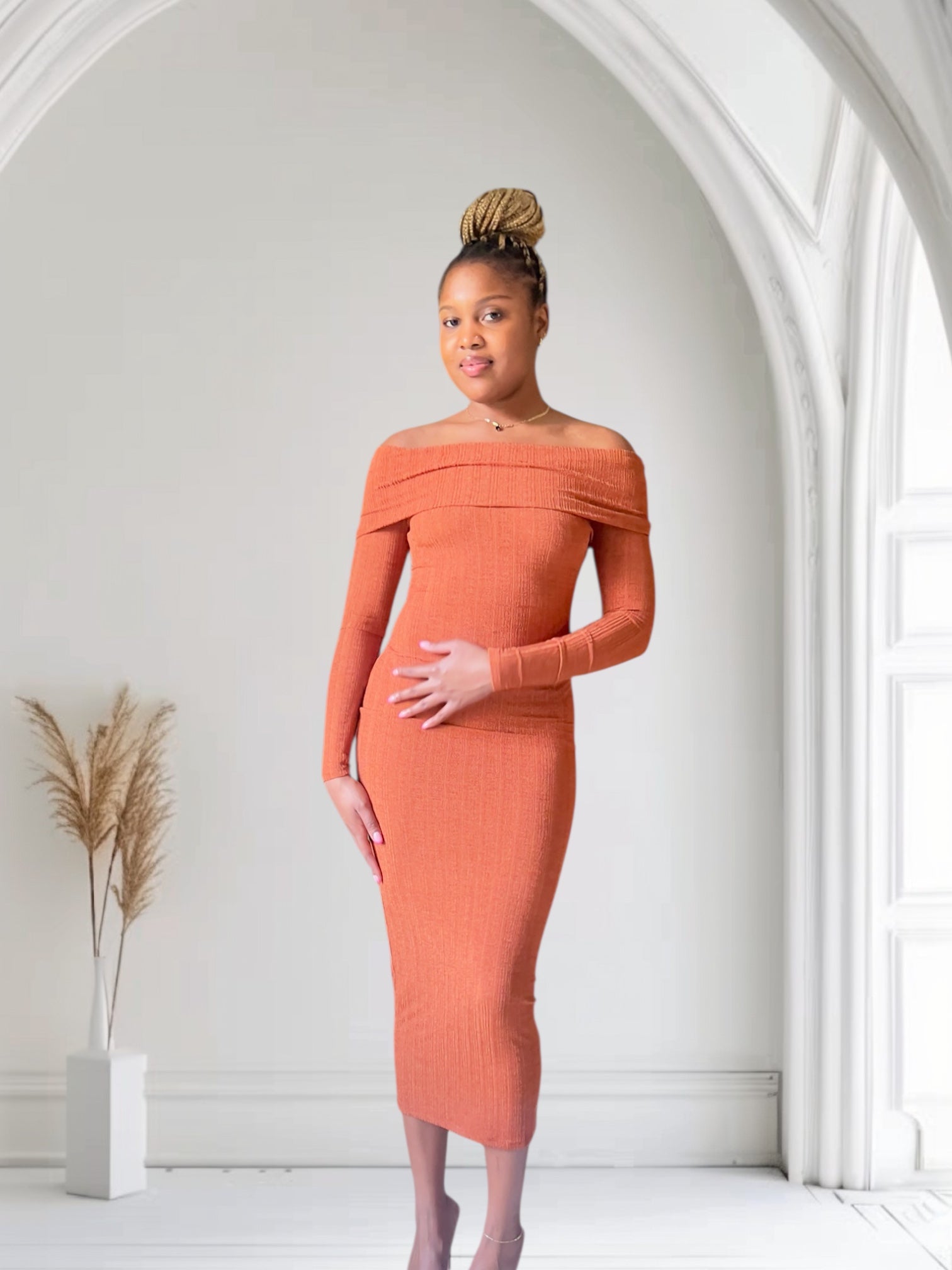 Step into warmth, confidence, and effortless femininity with the Ember Off-Shoulder Ribbed Midi Dress. Designed with ultra-stretchy ribbed fabric, this midi smooths, shapes, and highlights your silhouette while keeping you cozy and chic. The off-the-shoulder neckline adds the perfect touch of elegance, making this dress ideal for brunch, dinner dates, church, or any moment you want to shine with subtle bougie flair.