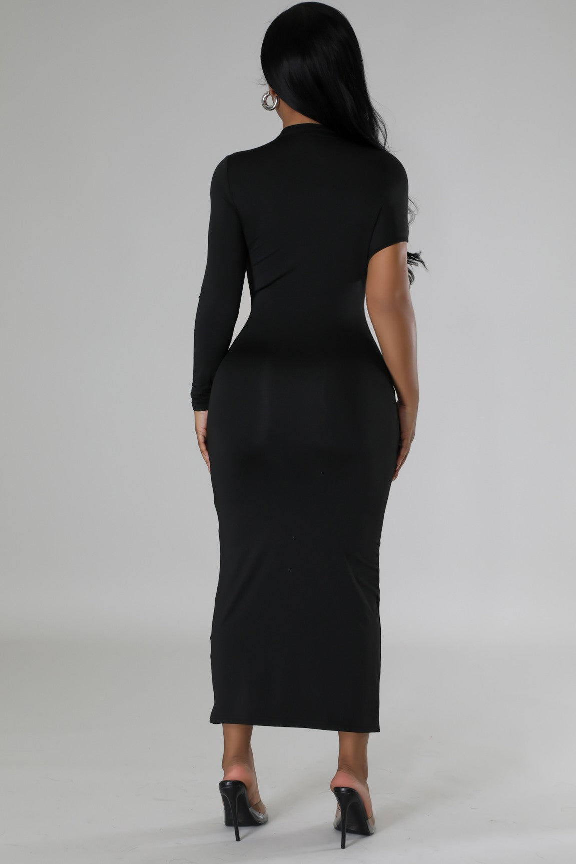 This sleek black stretch dress features a striking asymmetrical sleeve design with one long sleeve and one short sleeve, creating a modern, fashion-forward silhouette. The mock neckline adds a touch of sophistication while the dramatic cutout detail with underbust accent highlights the waist and enhances your natural curves.