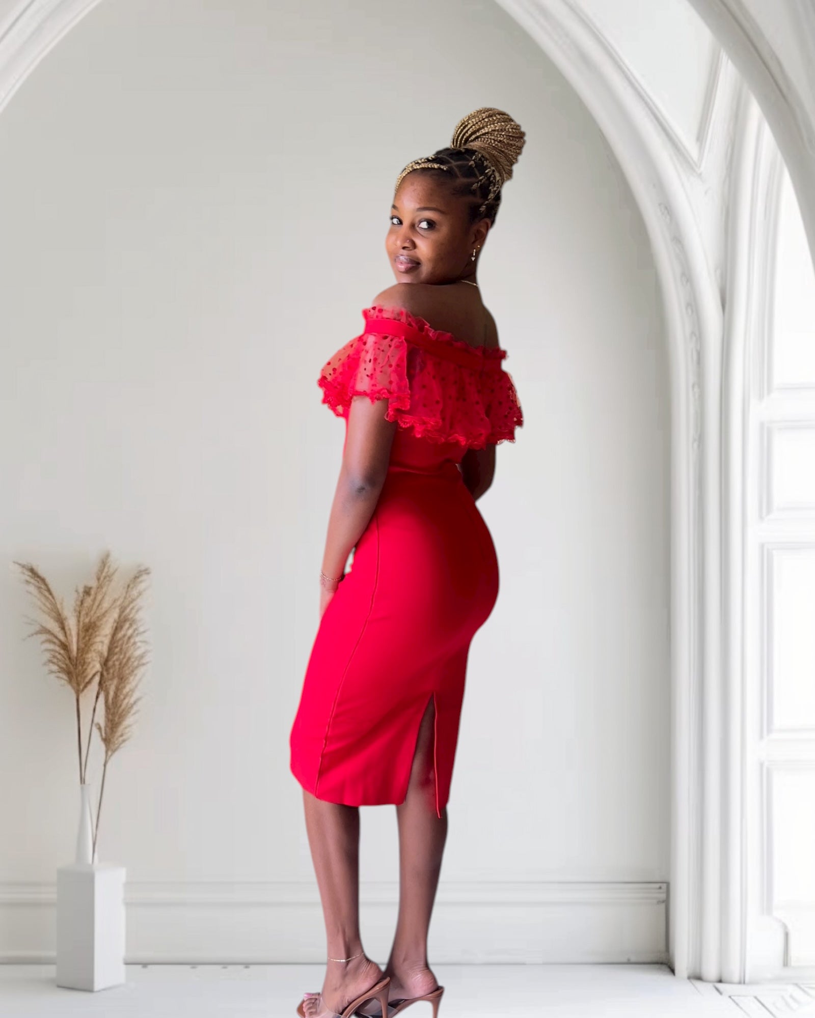 Lady Luxe Off-Shoulder Bandage Dress | Red Ruffle Midi Dress