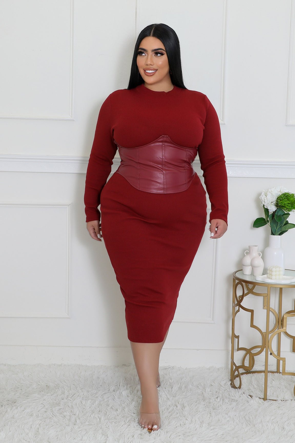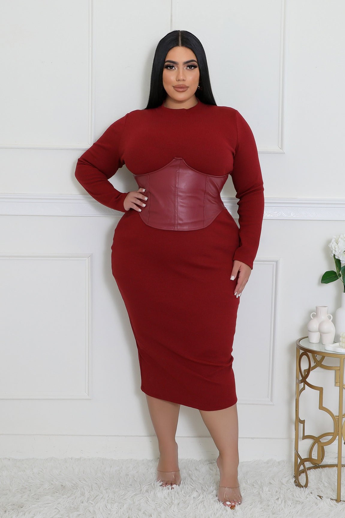 Turn heads and own every room in the Ruby Reign Corset Midi Dress — a statement piece that blends sophistication, structure, and allure. Designed in a deep ruby red hue, this stunning stretch midi hugs your curves while the sleek faux-leather corset detail defines the waist, creating a sculpted hourglass silhouette that exudes confidence and grace.