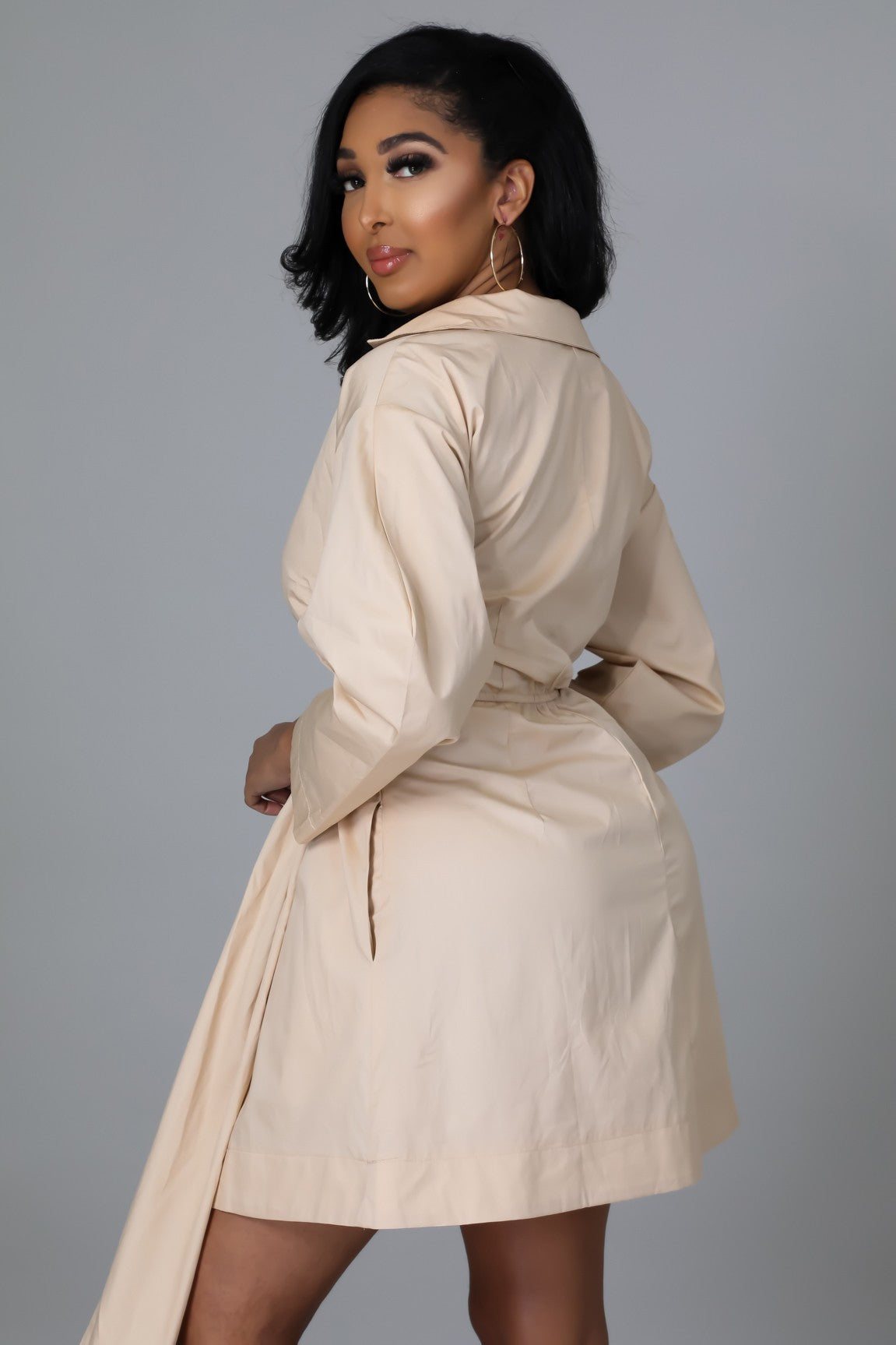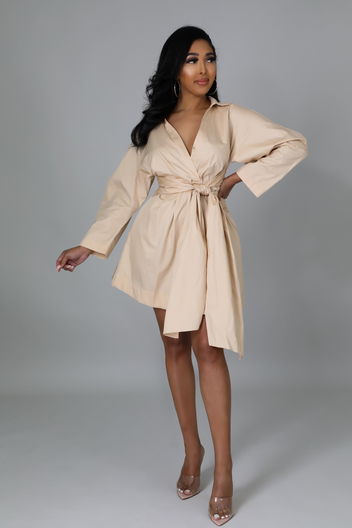 Beige Tie Waist Tunic Dress – Long Sleeve Shirt Dress