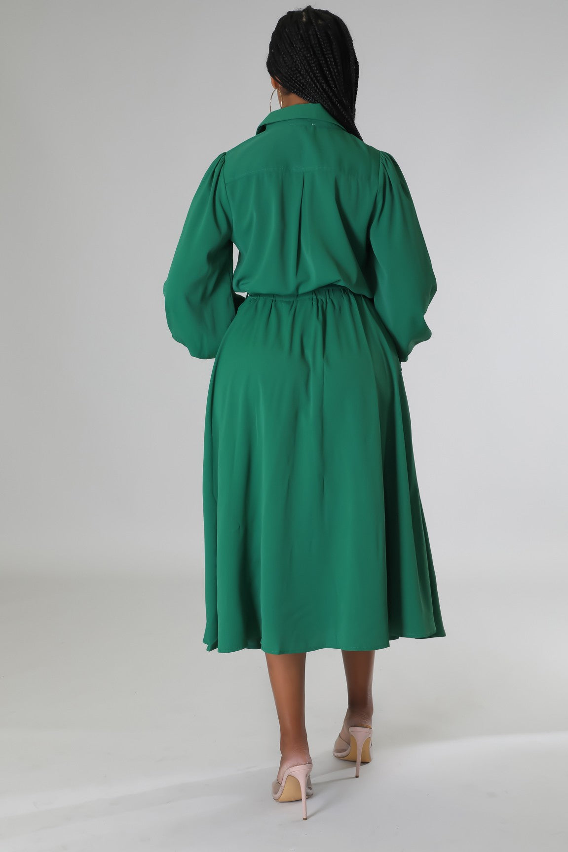 The Emerald Grace Long sleeve Dress is designed for the woman who carries elegance effortlessly. The structured collar and button-down front give classic sophistication, while the flowing midi skirt brings movement and feminine charm.