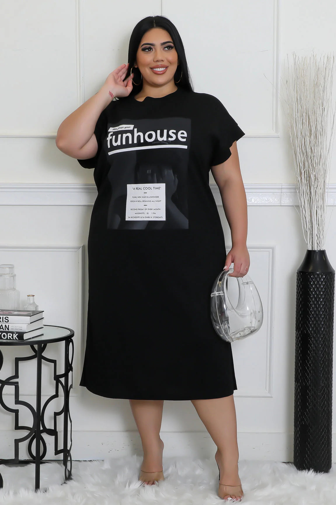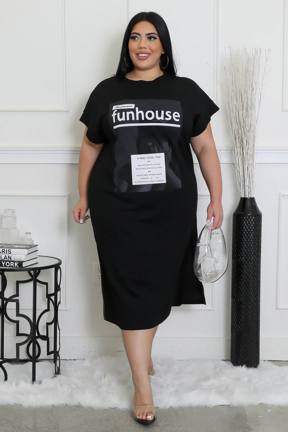 Comfort meets statement style in the Funhouse Graphic Plus Size Midi T-Shirt Dress. Designed with a relaxed, curve-friendly fit, this stretch midi dress features a bold front graphic that adds effortless edge to your everyday wardrobe.