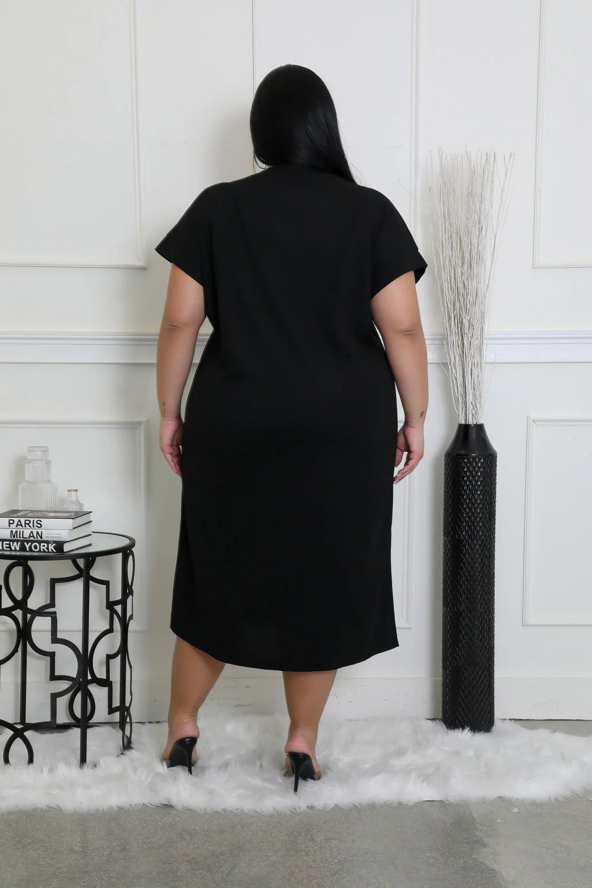 The classic round neckline and short sleeves keep the look casual and wearable, while the side slit adds movement and a flattering finish. Crafted from a soft stretch blend, this dress offers all-day comfort without clinging — perfect for brunch, errands, travel, or casual nights out.