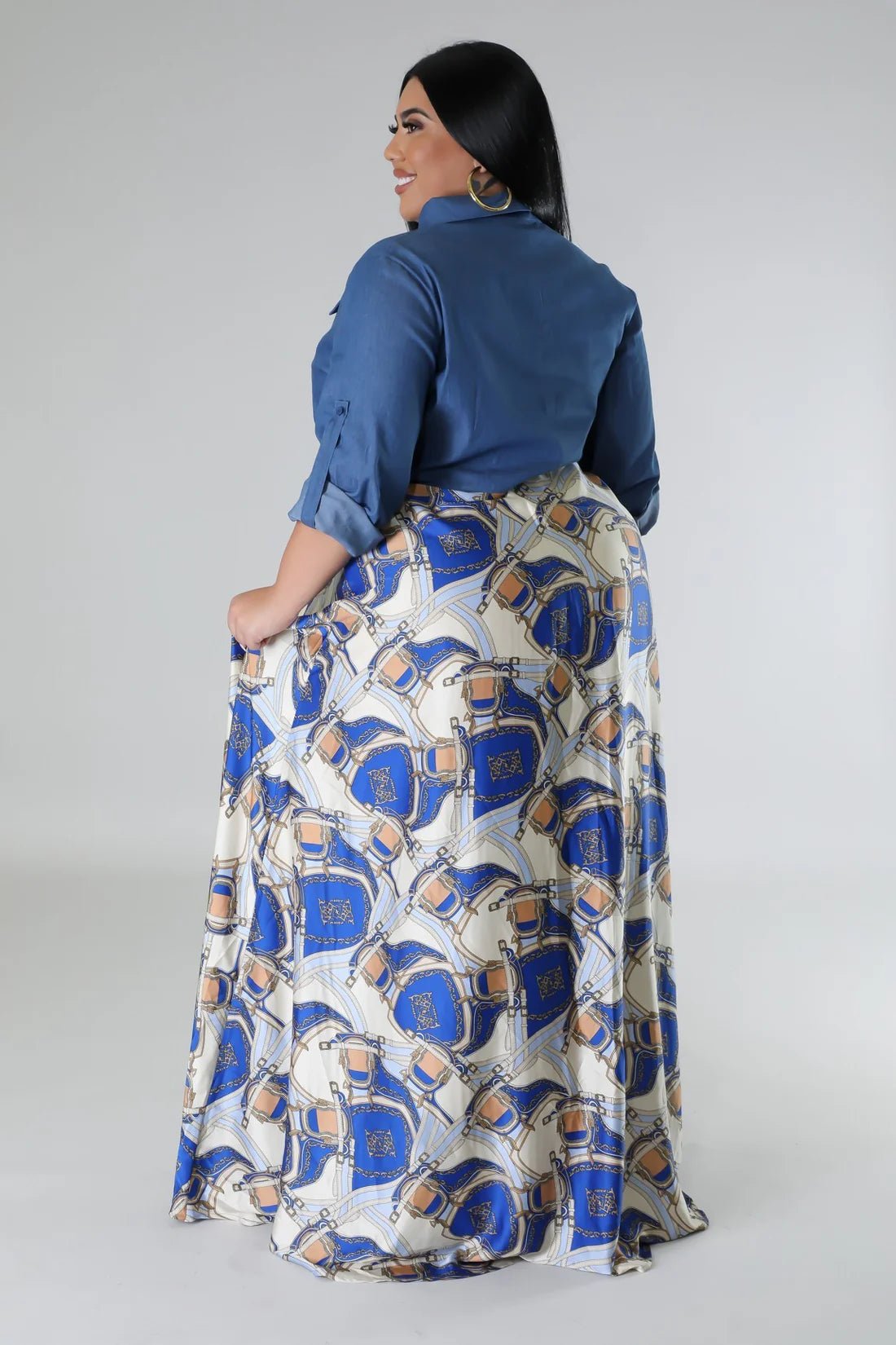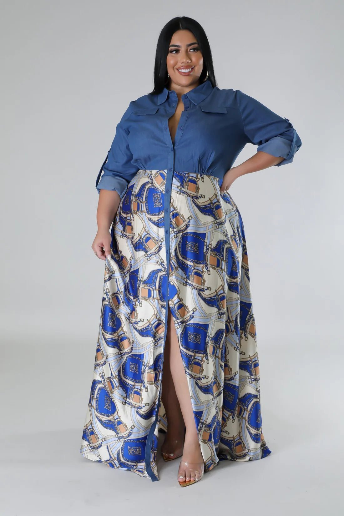 The structured denim-style top creates a flattering, tailored fit with its collared V-neckline and long sleeves, while the bottom transforms into a silky satin maxi skirt adorned with a bold blue-and-gold chain print.
