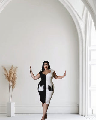 Plus size model wearing a black bodycon dress with bold pink plaid sequined statement sleeves, mid High dress