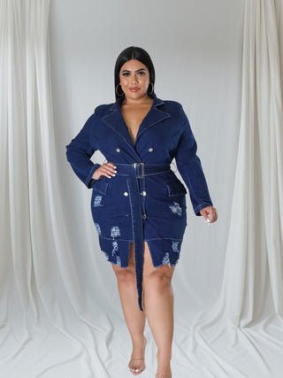 Plus-size woman wearing off-the-shoulder blue denim summer dress with self-tie waist and pockets — Tulley’s Boutique
