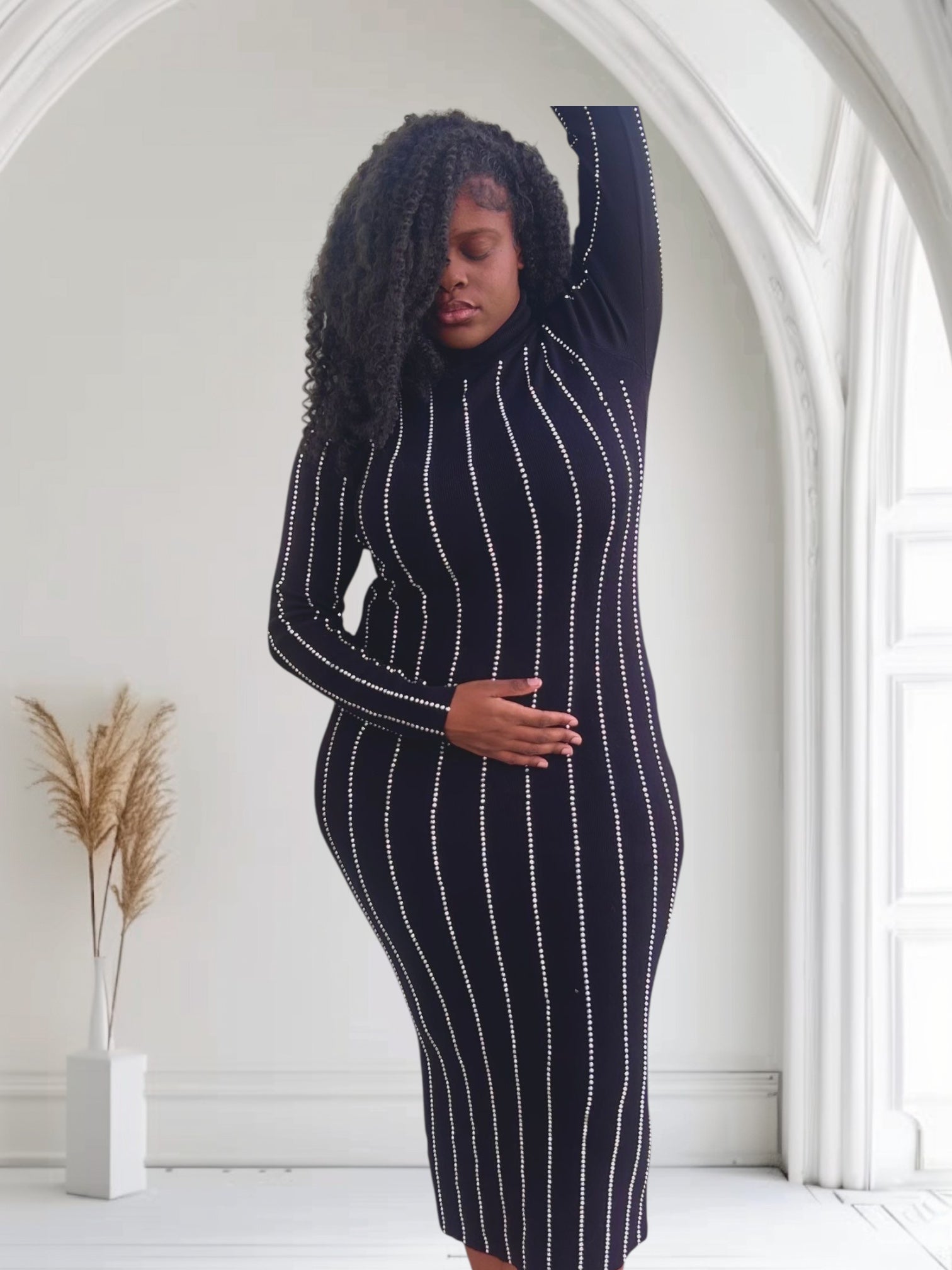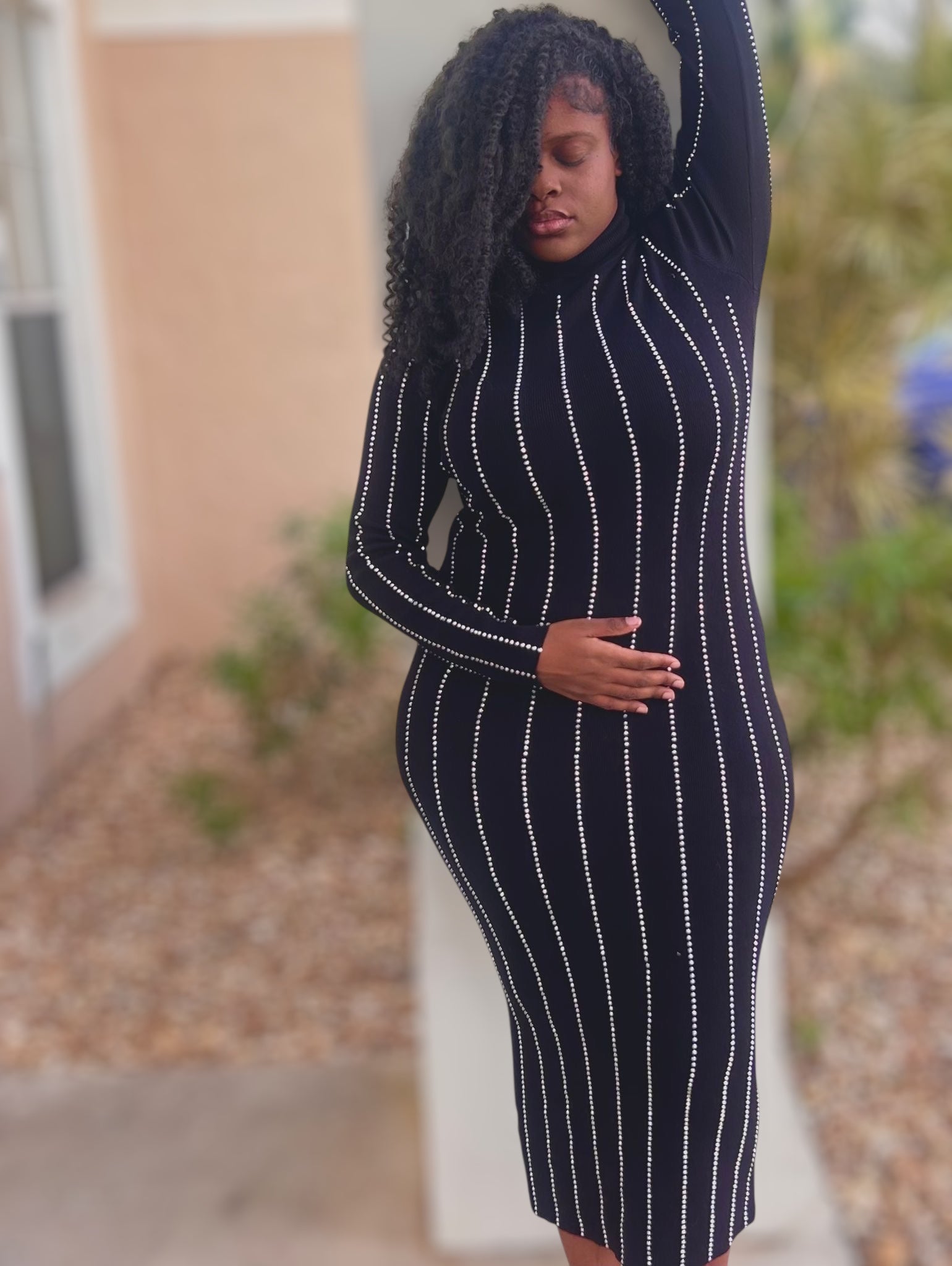 Command attention with the Diamond Aura Rhinestone Midi Dress, where sophistication meets shimmer. This stretch bodycon silhouette is crafted to contour your curves beautifully, featuring vertical rhinestone detailing that elongates the figure and adds just the right amount of sparkle. The long sleeves and turtleneck design bring elegant coverage, making it perfect for upscale dinners, events, or night-out moments that call for pure glam.