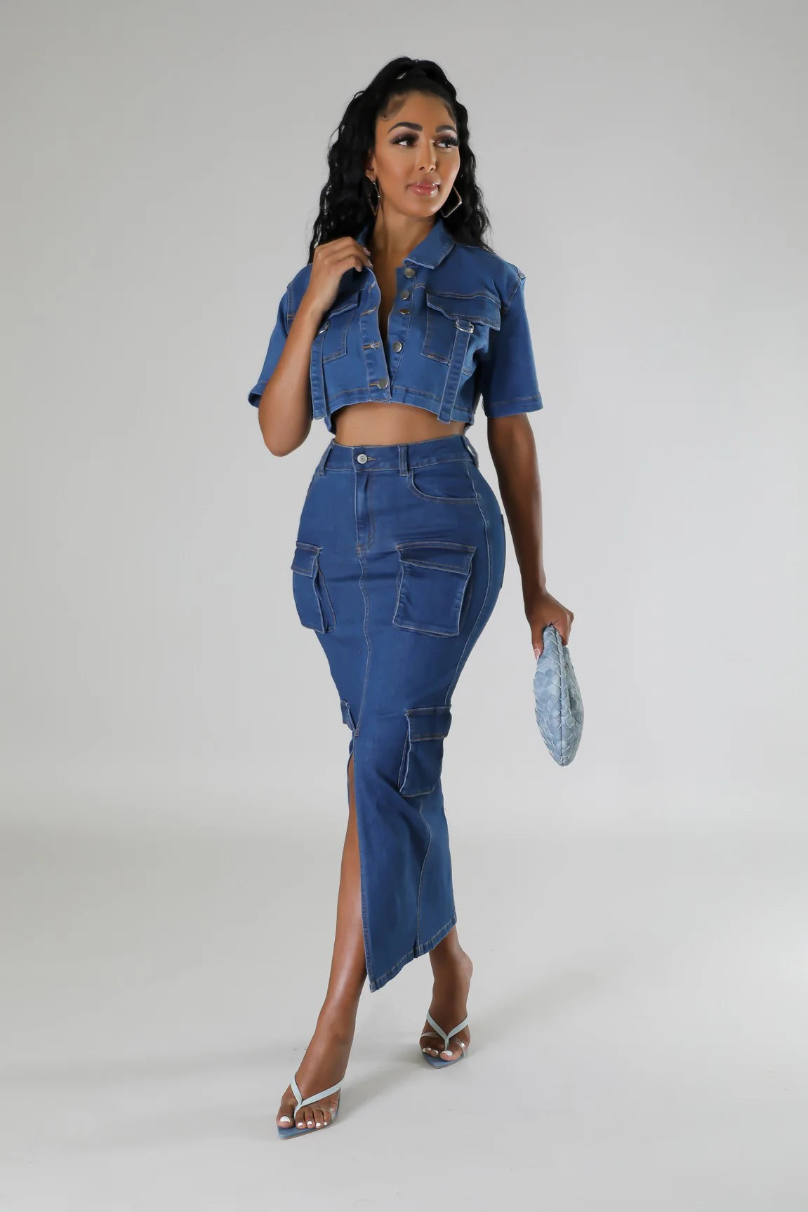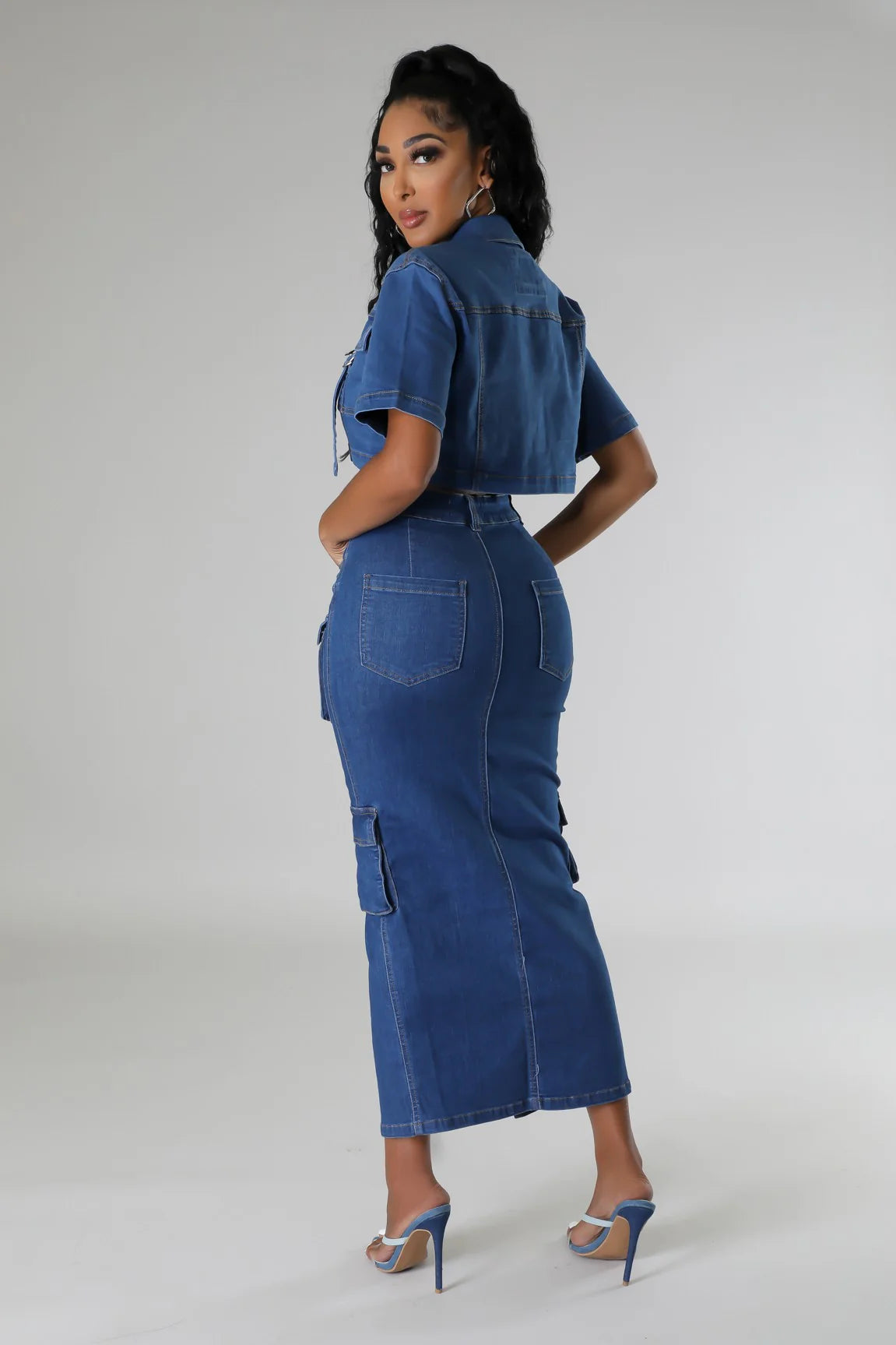 This blue denim cargo maxi skirt is where structure meets stretch. Designed with a flattering high-waisted fit and a modern cargo silhouette, this skirt hugs your curves while allowing comfortable movement throughout the day.