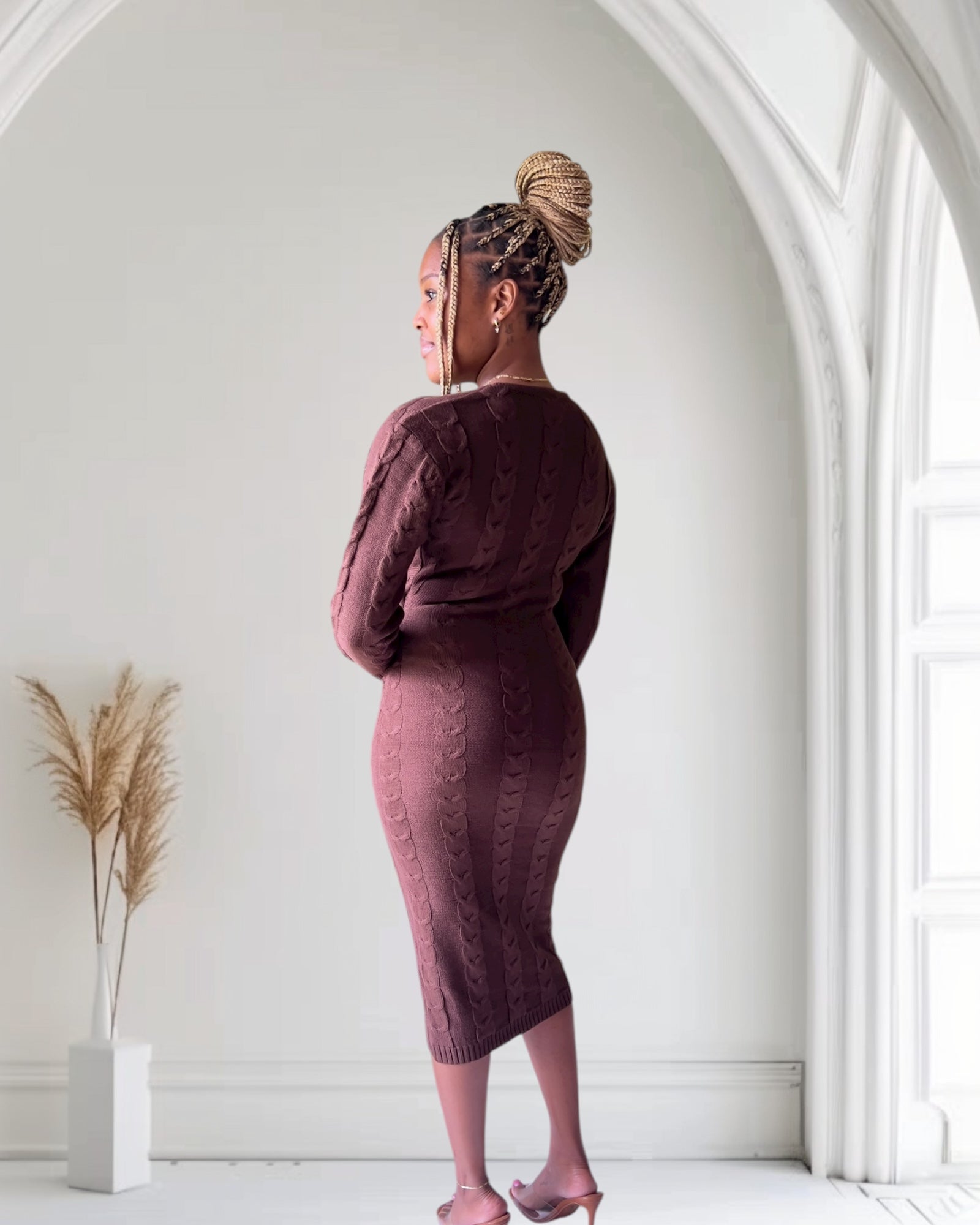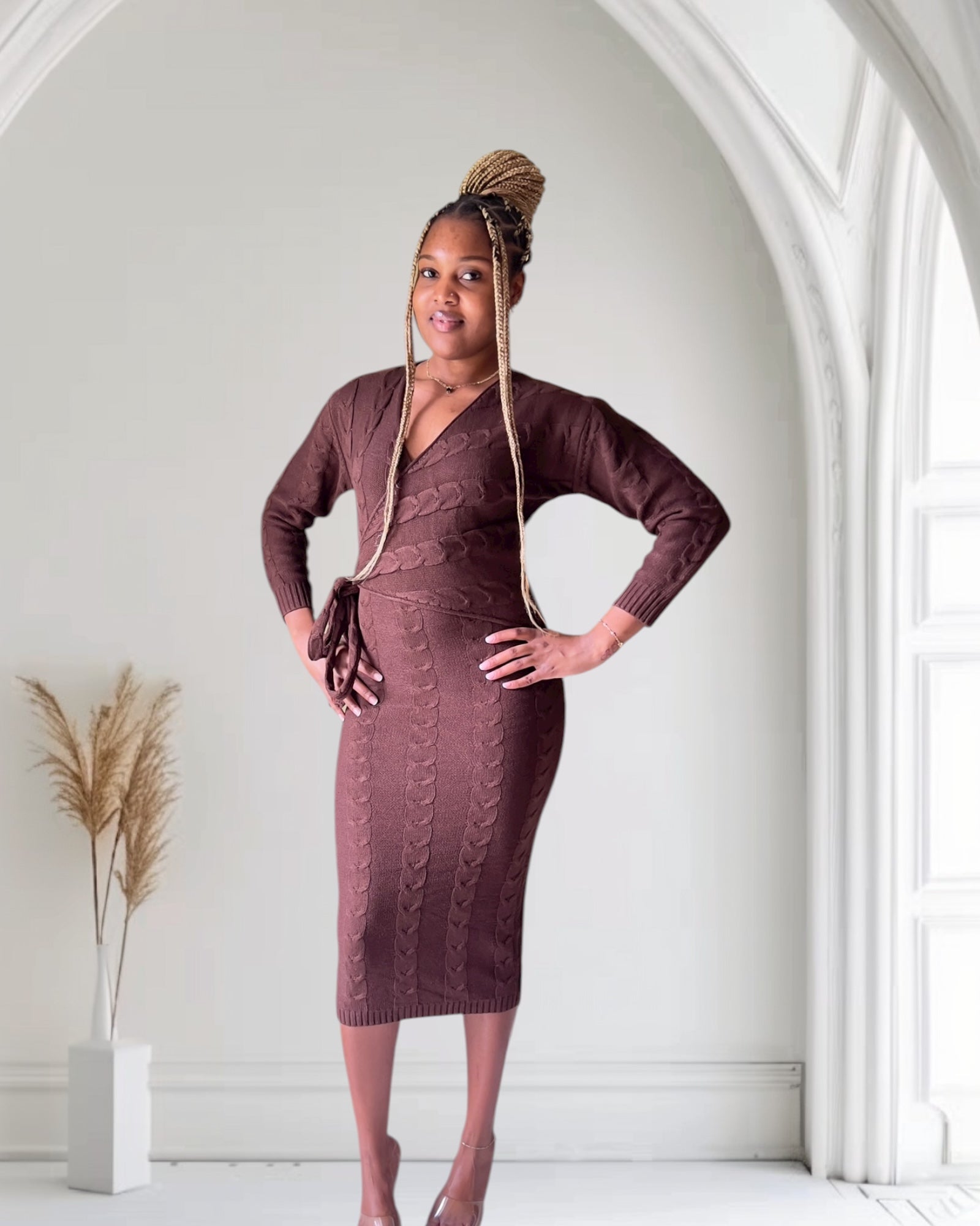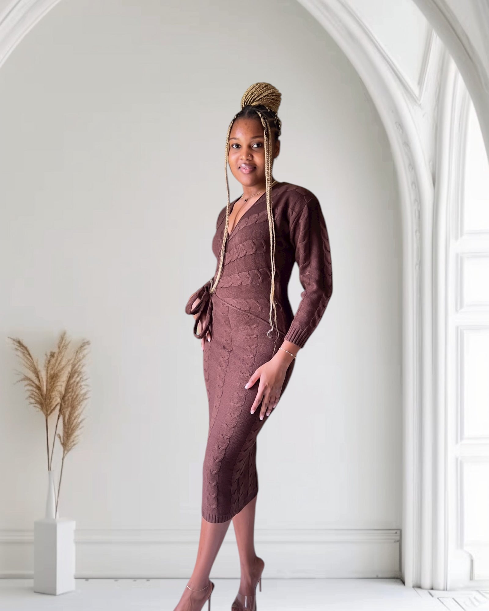 Wrap yourself in sophistication with the Cocoa Embrace Sweater Dress, a timeless stretch-knit piece designed to flatter and define every curve. Crafted in a rich chocolate hue, this long-sleeve midi features a deep V-neckline and a self-tie waist belt that cinches the silhouette with effortless elegance.